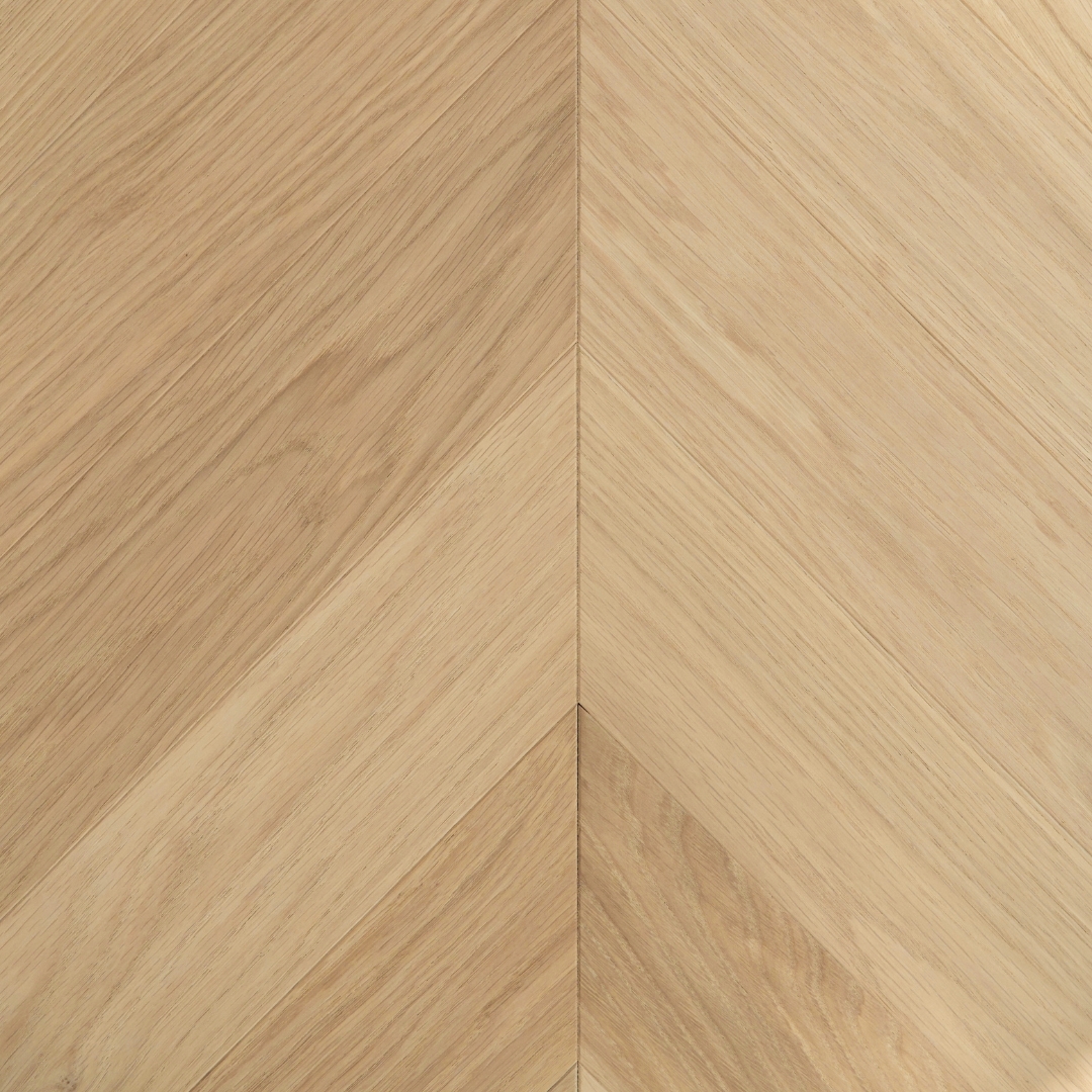 Aidosta puusta valmistettu pintakäsittelemätön ja kerrosrakenteinen Chevron parketti 4mm tammi pintaviilulla. Sävy, oksaisuus ja koko räätälöitävissä juuri sinun tarpeisiisi halusit sitten vaalean sävyisen tai tummemman sävyisen lattian.
