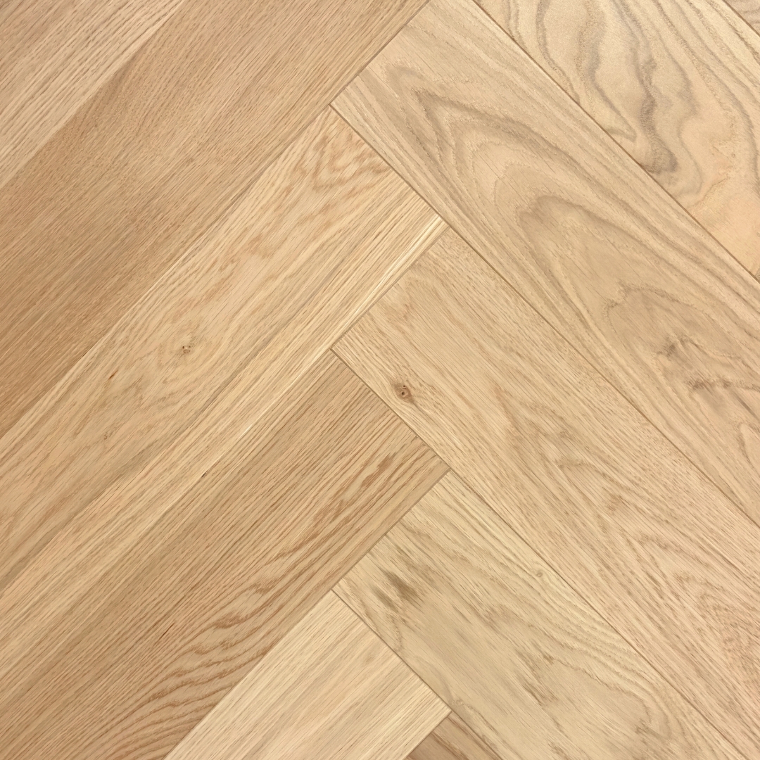 Aidosta puusta valmistettu pintakäsittelemätön ja kerrosrakenteinen kalanruotoparketti 4mm tammi pintaviilulla. Sävy, oksaisuus ja koko räätälöitävissä juuri sinun tarpeisiisi halusit sitten vaalean sävyisen tai tummemman sävyisen lattian.