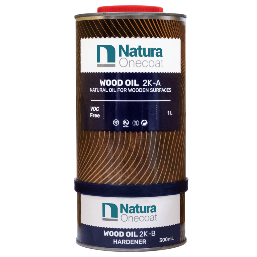 Pintakäsittely asennuksen jälkeen Natura Onecoat 2K-puunsuojaöljyllä. Sävyksi valikoitu Natural White.