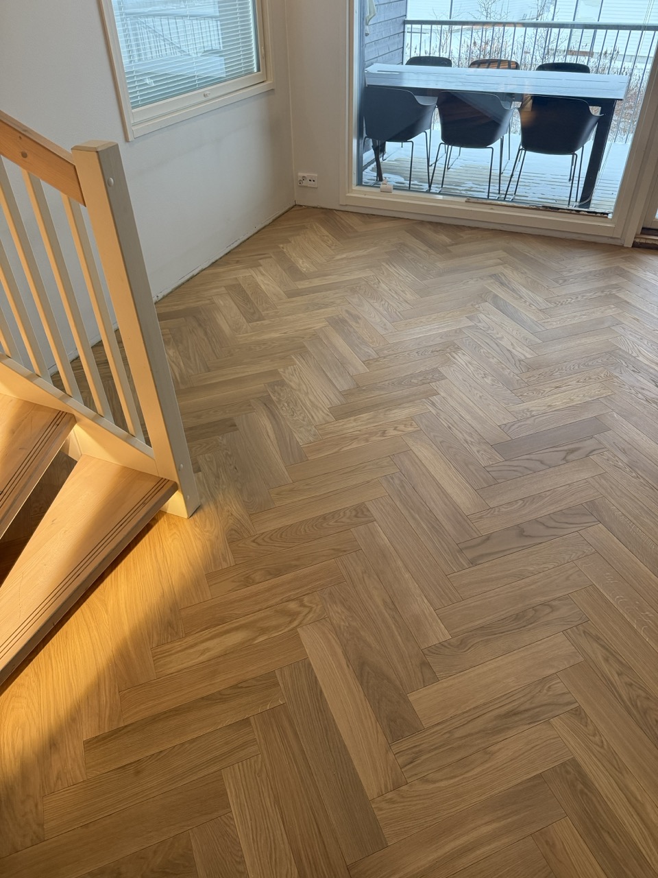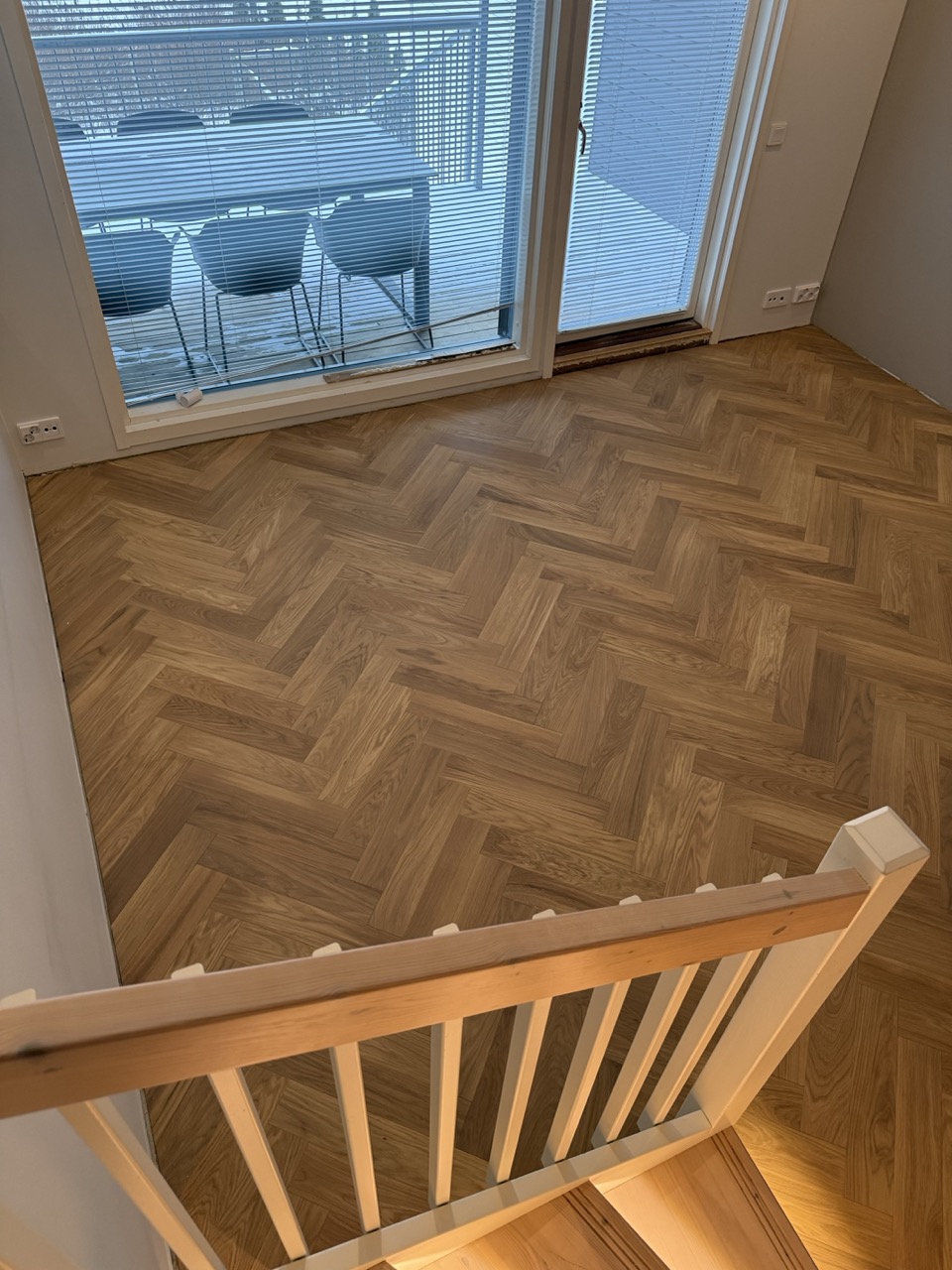 Parkettistudio Helsinki asensi asiakkaalleen Heritage- kokoelman Tammi Natur Kalanruotoparketin Espooseen.