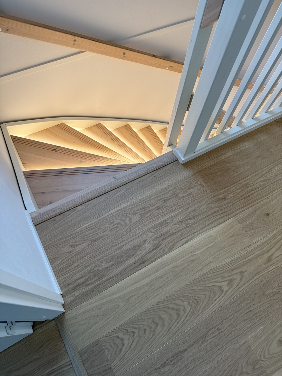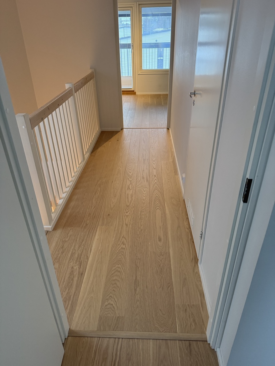 Yläkerrassa kelluvana asennettu 1-säleinen lankkuparketti Sense-mallistosta. Kokonaisuus muodostaa harmonisen ja modernin kokonaisuuden, jossa alakerran klassinen kuvio ja yläkerran selkeä lankkupinta täydentävät toisiaan.