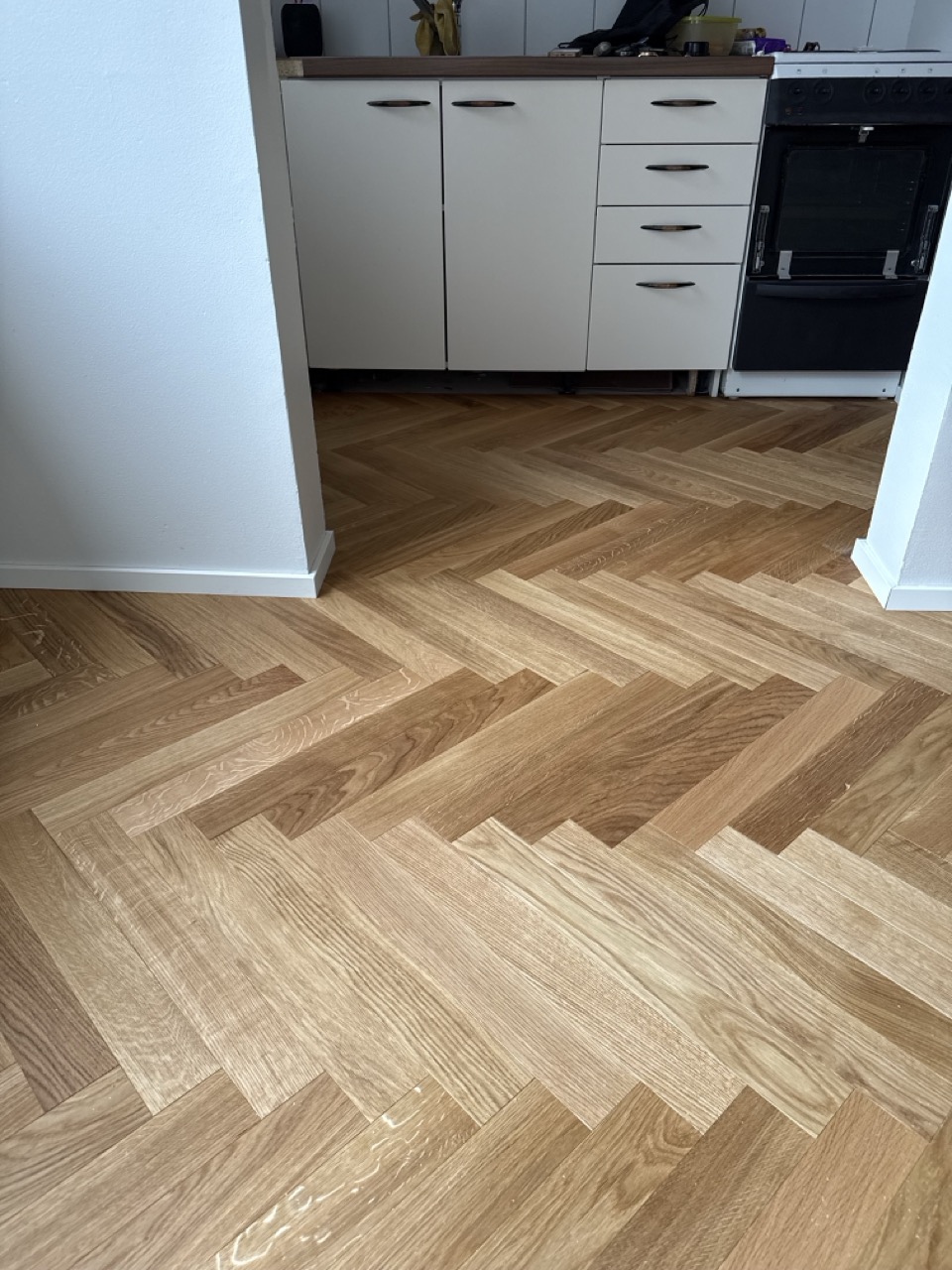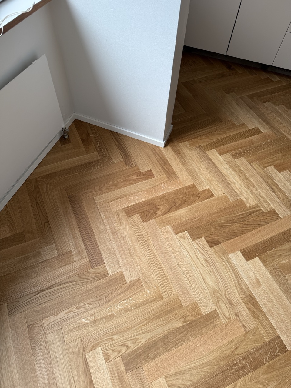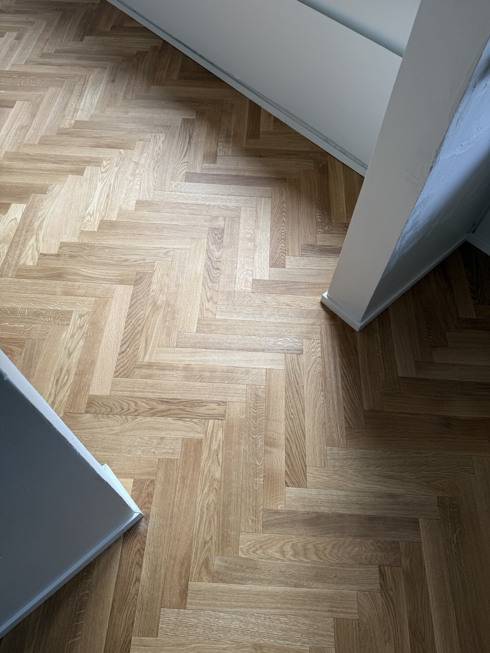 Parkettistudio Helsinki asensi asiakkaalleen upean puuvalmiin Tammi Select Kalanruotoparketin Lauttasaareen. Kaikki Heritage- kokoelman kerrosrakenteiset parketit ovat pintakäsittelemättömiä, ja vaativat pintakäsittelyn asennuksen jälkeen. Pintakäsittelyksi valikoitui luonnollinen ja laadukas Natura Onecoat 2K-puuöljy (Clear).